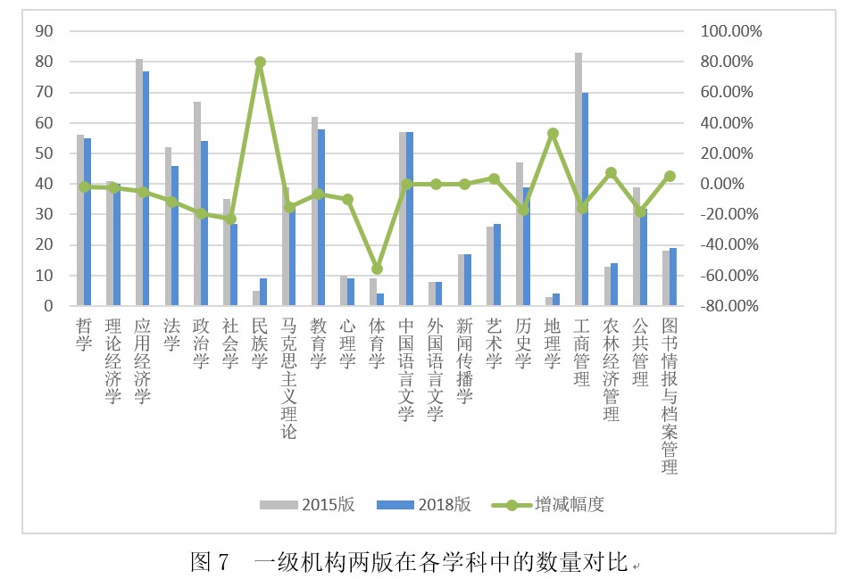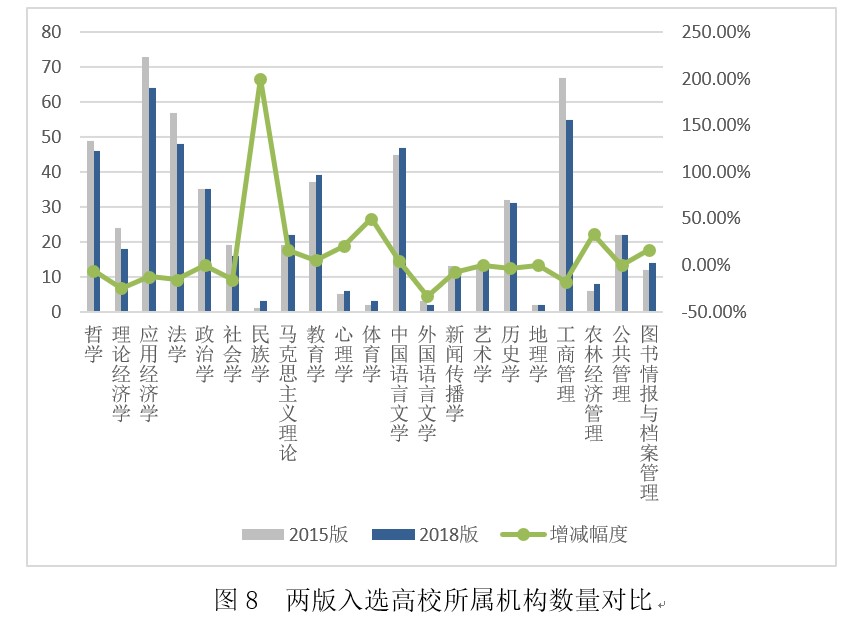 从各学科高等院校所属机构的入选情况看,虽然部分学科的增减幅度较大,但增减数量并不多。入选的高等院校所属机构数量增加的学科,以小学科为主,如民族学、心理学、体育学等,而入选机构数量较多的学科减少数量较大,例如2018版中,应用经济学入选机构数量比2015版减少9家,最终入选64家,法学比2015版减少9家,最终入选48家,工商管理比2015版减少12家,最终入选55家。
