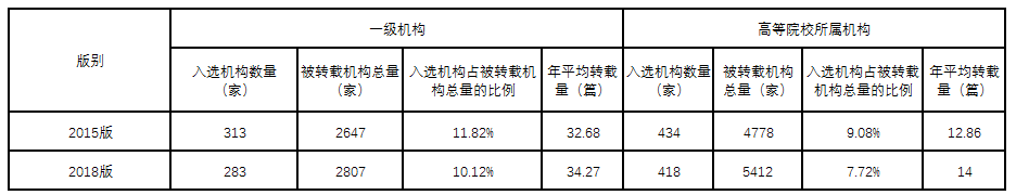 从两版的整体数据看,2018版的入选机构数量有所减少,同时2015版统计的是两年复印报刊资料转载数据,而2018版是根据2015—2017三年的转载数据制订,被转载机构总量相应增加,因此入选比例降低更为明显。入选机构年平均转载量均有所上升,显示出2018版的重要来源机构入选难度提高。