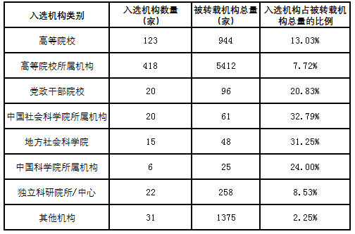 (7)独立科研院所/中心:不隶属于上述六类机构、但由国家正式批准成立的独立研究机构。直属于党政机关的研究机构算作此类,单独统计转载数据,如北京教育科学研究院;各类机构内设的研究机构计入所在机构,比如国务院发展研究中心宏观经济研究部,计入国务院发展研究中心。