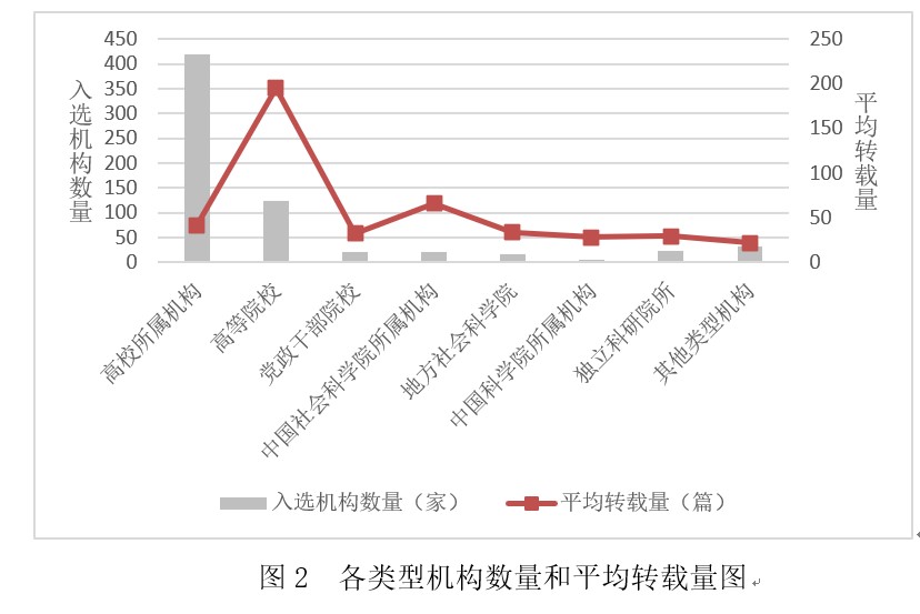 转载分析法是通过一次文献被著名学术文摘或期刊全文转载、摘要、索引的数量和比例等数据,分析机构的科研实力和影响力、学科或专业的分布规律等状况的定量研究方法,实质上是基于同行专家对论文的再次定性评价结果开展的量化分析。根据本次研究需要,我们根据复印报刊资料的选文数据,采用了转载量、篇均得分及其加权求和形成的机构转载综合指数作为初步指标。