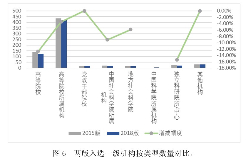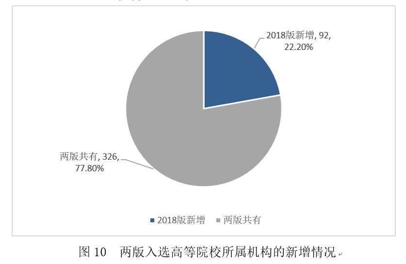 而入选2018版的418家高等院校所属机构中,与2015版相同的为326家,占77.80%,略低于一级机构的重合率。