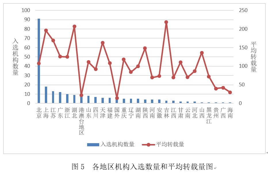 由图5可以看出,北京地区入选机构数量远超其他地区,也体现出了北京是中国人文社科研究力量的重地,上海、江苏、广东、浙江入选机构数量排入前五,并且港澳台地区入选机构也较多,排名第七。入选机构的平均转载量中,吉林与湖北依次位列前两名,其中湖北的入选机构数量排在第六,显示其在中国中部地区的人文社科实力;吉林入选机构数量较少,集中度较高,吉林大学和东北师范大学在该地区贡献最大。入选机构数量排名前十的地区中,位于东部沿海的有七个,显示了中国人文社科科研力量的地域不平衡。