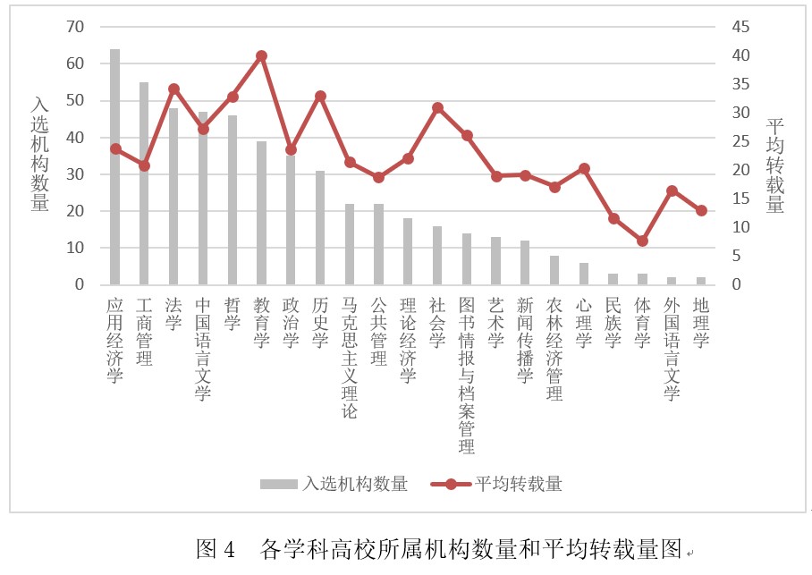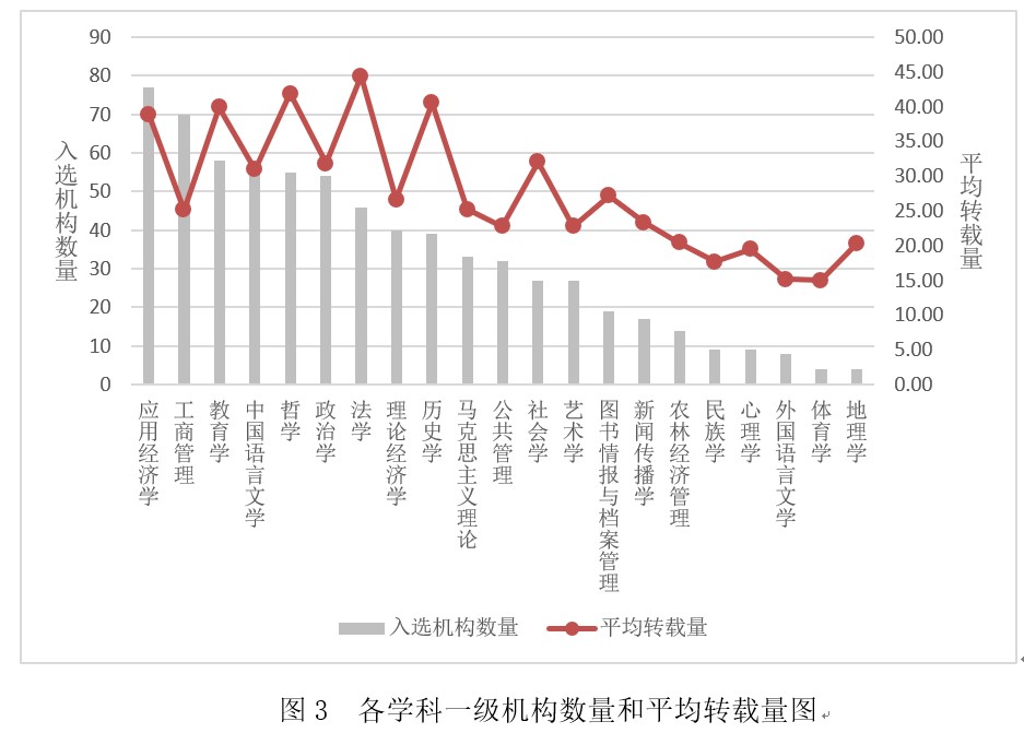 从图4可以看出,教育学平均转载量最高,达到40篇;哲学、法学、社会学、历史学的平均转载量随后,也均超过30篇。民族学、体育学、地理学的平均转载量相对较少,均没有超过15篇。社会学与图书情报与档案管理体现出相似的特征,入选机构数量不多(分别为16家、14家),但平均转载量较高(分别为30.94篇、26.07篇),体现出这两个学科中入选机构的优势比较突出。