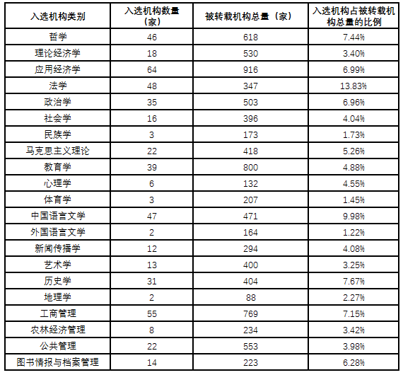 具体机构的学科分类,由其被转载论文所属的学科决定,如某机构被转载法学论文30篇、政治学论文20篇,那么该机构在法学中的综合指数,根据30篇法学论文的数据统计,在政治学中的综合指数,则根据20篇政治学论文的数据统计。