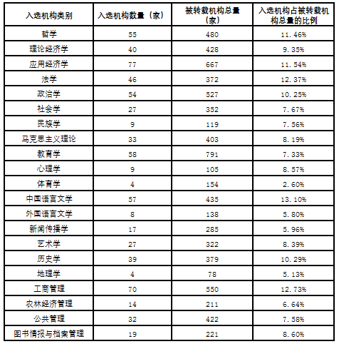 学科分类主要依据2011年国务院学位委员会、教育部发布的《学位授予和人才培养学科目录》,并结合复印报刊资料期刊学科布局和选文需要确定,分为哲学、理论经济学、应用经济学、法学、政治学、社会学、民族学、马克思主义理论、教育学、心理学、体育学、中国语言文学、外国语言文学、新闻传播学、艺术学、历史学、地理学、工商管理、农林经济管理、公共管理、图书情报与档案管理共21个一级学科。其中心理学和地理学数据统计,依据的是复印报刊资料转载的与人文社会科学相关的文章。