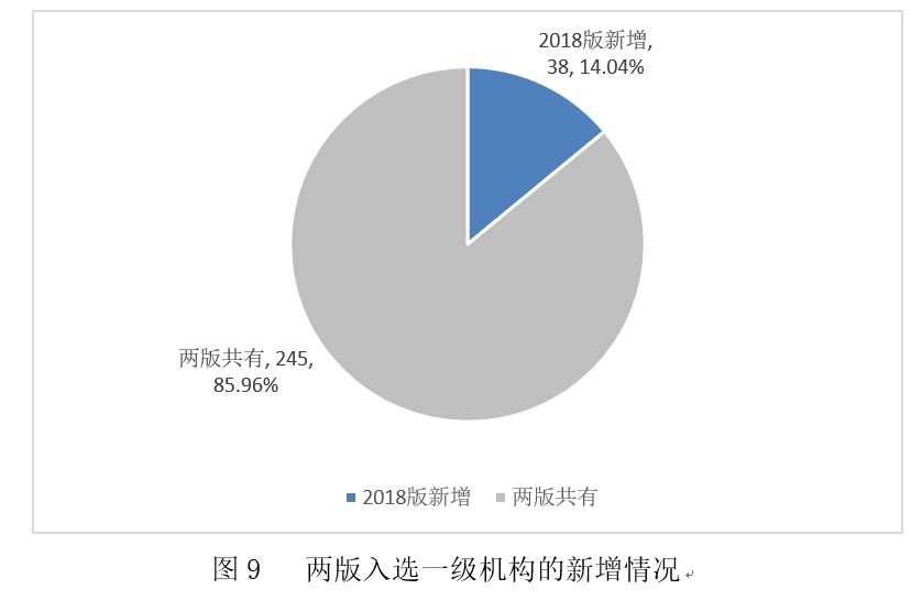 2015版与2018版有较高的重合率,显示出机构科研力量的稳定性和延续性。在入选2018版的283家一级机构中,与2015版相同的为245家,占85.96%。